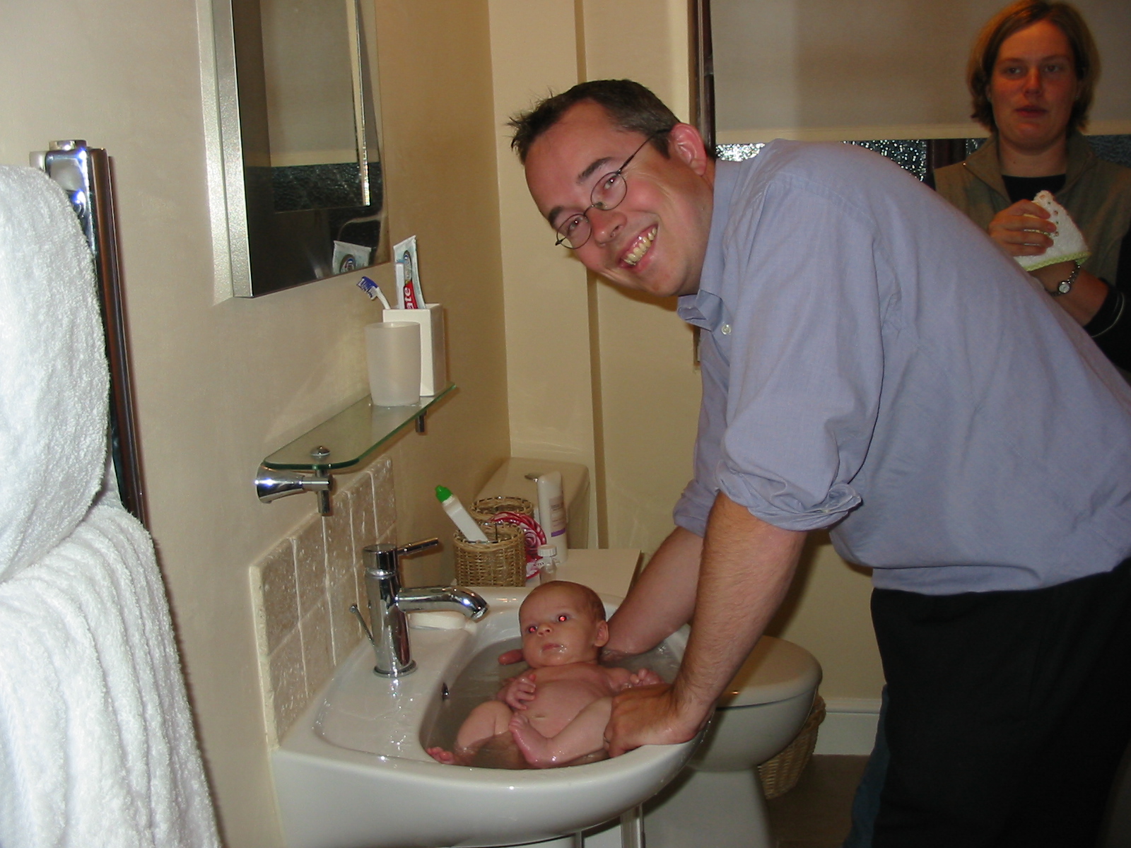 Andy, with Bronnie's son Tom when he was small enough to bath in a sink! Late 2005.